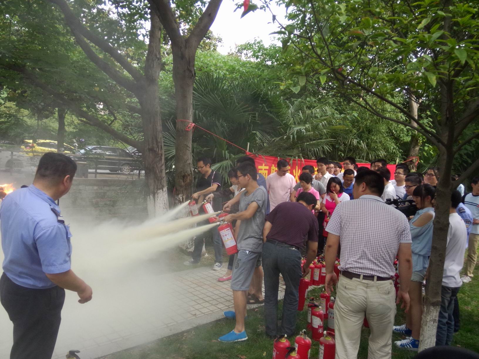 在12号教学楼旁边的空地上,校保卫处老师和消防科周栋栋老师首先给广大师生宣讲消防知识,并现场演示灭火器的使用方法。离演示老师身旁几米处的金属容器盆里提前放置了废木材并洒上了煤油,燃起熊熊火焰。演示老师一边向大家仔细讲解灭火器使用要领,一边实际动手操作演练。通过“一提、二拔、三按、四扫”成功将盆中的烈火扑灭。接着进入现场师生演练环节,在场师生使用演示老师展示的方法,四十分钟后,依次成功地完成了灭火演练。在场师生情绪高涨,踊跃积极参与,整个演练活动紧张有序。