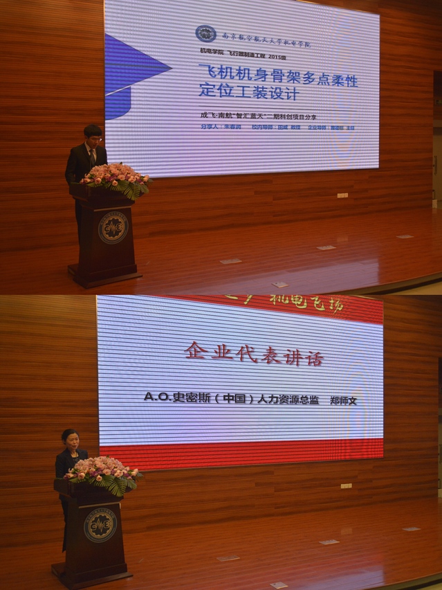 万众支持,职途未来,校企协同形成合力助力人才培养。长期以来,学院与社会各界一直保持密切联系,重视校企合作,拓展育人力量。目前,极品av 拥有昌飞、成飞、沈飞、汉中零组件及A.O.史密斯等5个校企俱乐部。其中成飞俱乐部成员朱春润作为代表讲述了他的科研故事,介绍了在成飞公司的实地调研,分享了在项目完成过程中的思考与感悟,激励更多机电学子加入校企俱乐部,将理论知识与实际生产情况相结合,为祖国的航空事业贡献青春力量。随后,其他4个校企俱乐部也形式各异地展示了学院校企俱乐部的风采。紧接着,A.O.史密斯(中国)人力资源总监郑师文作为企业代表发表讲话,她通过一组数据回顾了A.O.史密斯与南航的合作历程,对机电学子给予了高度的肯定和赞扬,表示未来欢迎更多的机电学子加入A.O.史密斯,还将进一步深化校企合作,通过多元化的渠道和措施助力我校人才培养。
