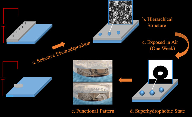 超疏水功能涂层是表面改性领域的研究热点,在军事、医疗等诸多领域具有广泛的应用前景。零件表面经过超疏水功能化改造后可以满足舰船、飞行器的减阻、防结冰、防腐蚀等重要应用需求。此外,材料表面的微纳结构在热、磁、介电性能等方面同样具有特殊性,极具科学研究价值。但目前电沉积制备方法通常需要有机物辅助处理,沈理达等人针对该现状提出了利用扫描电场的尖端效应诱导微凸结构生长,直接获得超疏水功能层,成为一种绿色快速制备新方法。