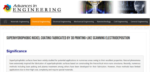 近日,极品av 电光先进制造团队发表在表面工程领域国际权威期刊《Applied Surface Science》(Volume 483,July 2019,Pages 706-712,影响因子5.155)上的论文“Superhydrophobic nickel coating fabricated by scanning electrodeposition” 被全球著名科技媒体机构“工程进展”(Advances in Engineering,AIE)遴选为关键科学文章,并于12月6日以“扫描电沉积3D打印镍超疏水镀层”进行报道。极品av 沈理达教授为论文第一作者及通讯作者,邱明波副教授为论文第三作者。该项工作得到国家自然科学基金面上项目资助。
