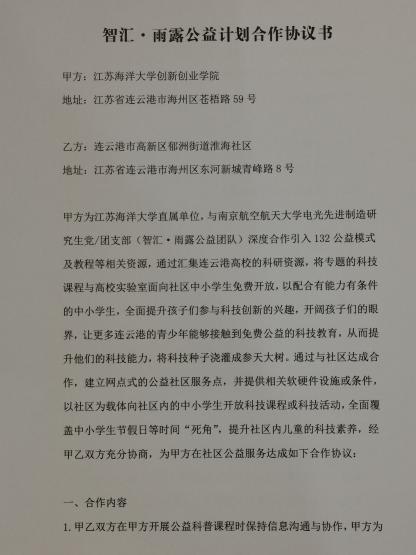 通过与江苏海洋大学创新创业学院、淮海社区和电光团队的三方会谈,决定由智汇•雨露公益团队协助创新创业学院以淮海社区为基础,依托高校科技资源,打开高校大门,创新科普形式,借鉴“132”成功模式,为社区打造科创空间公益科普服务网点,长久服务更多的社区中小学生。会议期间,三方还就具体合作细节、2020-2022年合作大概方案进行了讨论交流,并达成共识,共同签订了《智汇•雨露公益计划合作协议》。