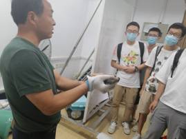 参观体验活动开始后,研究所的老师为同学们展示了学名为Gekko gecko的大壁虎,壁虎的每只脚底都长着数以百万计的刚毛,每根刚毛又有更多的分支,这种结构使得壁虎刚毛与壁面产生范德华力,足够多的范德华力可以使壁虎轻而易举地攀爬墙面。紧接着,研究生学长为同学们介绍了与鸽子相关的研究,将研究的芯片和电路板与鸽子关联实现远距离控制鸽子的飞行方向、路径等行为,并且相关设备在一段时间后将从鸽子身体自然脱落,不会影响鸽子的正常生活及繁衍。