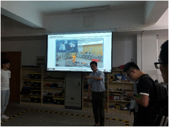 接着,朱老师向同学们介绍了新型制造模式的相关技术以及实验室已开展的相关工作。同时,朱老师通过动画仿真与实物视频的形式为同学们展示了“基于物联技术的自组织智能制造系统”的原型系统与应用验证。整条生产线实现了接收用户个性化订单、智能立体仓库执行操作,到智能化加工、运输存储完整运作,体现了“智能控制”这一新型制造模式的核心。各个设备都具有感知、分析、决策、控制等能力,能够通过已经搭建好的智能控制节点去完成工作,具有极高的灵活性。