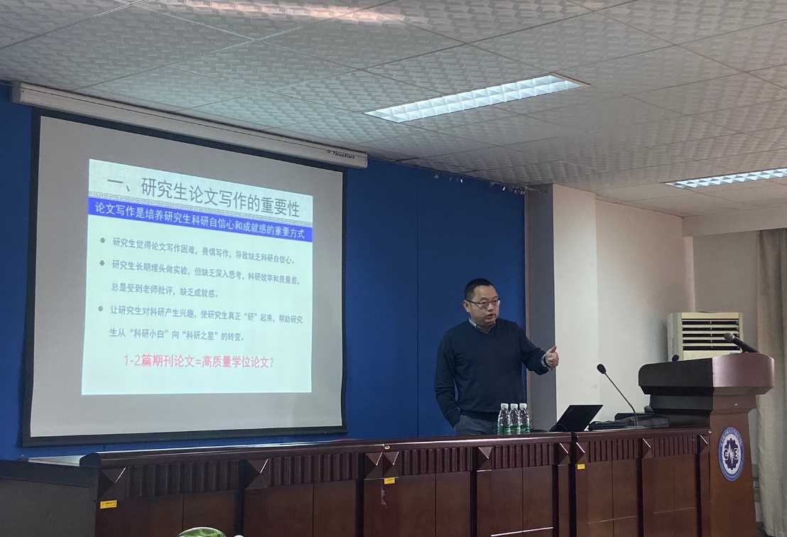 丁文峰教授首先做了关于《研究生论文写作能力培养与质量保障》的报告,从研究生论文写作、写作能力培养、学位论文质量保障三个方面进行分享,并结合自身在研究生培养方面的成效和实例,指出在研究生高质量论文写作能力培养中,研究生导师的信心、耐心和责任心的重要性。