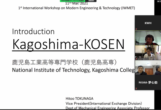3月11日上午,“1st International Workshop on Modern Engineering & Technology (1st IWMET)”线上本科毕设答辩会议在明故宫校区15号楼341会议室举行。日方参加此次会议的主要人员有:分管国际交流的副校长H. Tokunaga教授及K. Shimana教授、Y. Kobaru教授、Y. Kawano教授等,本科生Tomoyuki Hirotani和Kouhei Yamashita等10余人;极品av 参会的主要人员有:左敦稳教授、孙玉利教授以及部分研究生、大四年级本科生10余人。会议由日本鹿儿岛工学院副校长Hitoo Tokunaga教授主持。