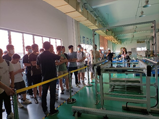 活动伊始,由副总工程师何杏兴带领大家参观熊猫电子的机器人智能制造工厂,涵盖了工业机器人区、人工作业区、装配区、信息化系统等核心区域,并详细讲述了每个区域涉及到的智能制造生产技术,使同学们对熊猫电子的主要研究方向、涉及的行业领域以及未来发展前景等有了更深入的了解。