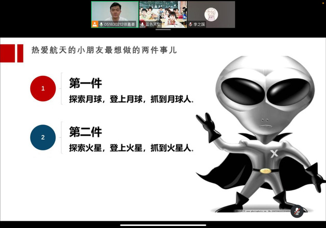 考虑到小朋友们的信息接收能力,授课小组制订了卡通风趣的授课材料,其中不乏小朋友们最感兴趣的“外星人”、“UFO”等角色,为课堂增添了无限的趣味。课程一开始,徐嘉豪就通过怪萌的火星人吸引小朋友的注意力,为枯燥的课堂增添了无限的趣味,随后逐渐深入到寻找“火星人”的具体举措中,开始讲述航空航天知识。