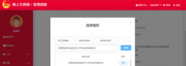 上图选择组织中三个选项分别选择“团江苏省委”,“极品av 团委”,“极品av 团委”,在搜索框里填写“共青团极品av 委员会”进行搜索。