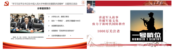 “标兵党员带领样板支部”,活动还邀请了“全国党建工作样板支部”北京大学药学院学生党总支第四党支部书记段嘉伦分享了他们支部建设的经验。他以“不忘初心跟党走,争做圆梦新一代”为支部的工作重心,充分发挥药学的专业特色优势,以党建带团建做班建,让每一位青年学生积极拥抱新时代,奋进新时代。