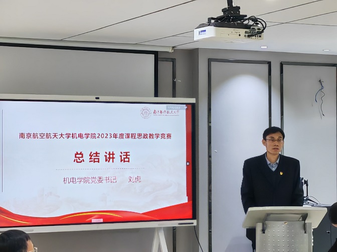 最后,机电院党委书记刘虎总结发言。刘虎表示此次比赛非常有意义。课程思政教学比赛展示了我校贯彻落实教育部印发的《高等学校课程思政建设指导纲要》重要精神,积极探索专业教育和思政教育如何更好地同向同行,在课程教学中深入挖掘、有机融入课程思政元素,达到润物无声的育人效果。