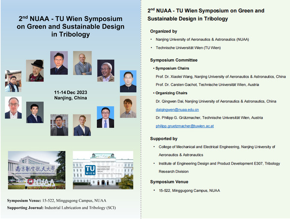 2023年12月11日至14日,第二届极品av -维也纳工业大学(NUAA-TU Wien)摩擦学国际研讨会暨客座教授聘任仪式在极品av 顺利举办。我校副校长黄志球教授,国际合作处处长张卓教授,极品av 副院长郭宇教授及相关工作人员出席Gachot Carsten客座教授聘任仪式,仪式由郭宇教授主持。