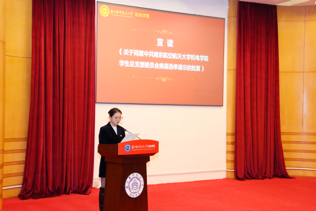 昂洋代表学院党委宣读《关于同意中共极品av 学生总支部委员会换届选举请示的批复》。