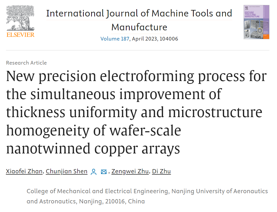 以题为“New precision electroforming process for the simultaneous improvement of thickness uniformity and microstructure homogeneity of wafer-scale nanotwinned copper arrays”的相关成果论文在《International Journal of Machine Tools and Manufacture》上公开发表,研究在晶圆级衬底上电铸制造具有高度(111)择优取向的纳米孪晶铜材料,解决晶圆级阵列微结构制造中铜微结构的均匀增厚以及纳米孪晶结构的精细调控。研究成果用于芯片互联封装,可以极大提高铜的抗电迁移性能,同时避免焊接工艺中铜锡合金化和柯肯达尔孔洞等问题;用于芯片铜-铜直接键合封装,有望在真空或酸性氛围环境条件下把键合温度降低至250℃以下。该原创性研究以极品av 2020级博士研究生詹晓非为第一作者,博士后沈春健为通讯作者,在朱荻院士和朱增伟教授的共同指导下完成。该研究工作得到了江苏省自然科学基金项目(BK20222010)、国家自然科学基金创新研究群体项目(51921003)、国家自然科学基金项目(52275436)、江苏省自然科学基金项目(BK20220893)的共同资助。