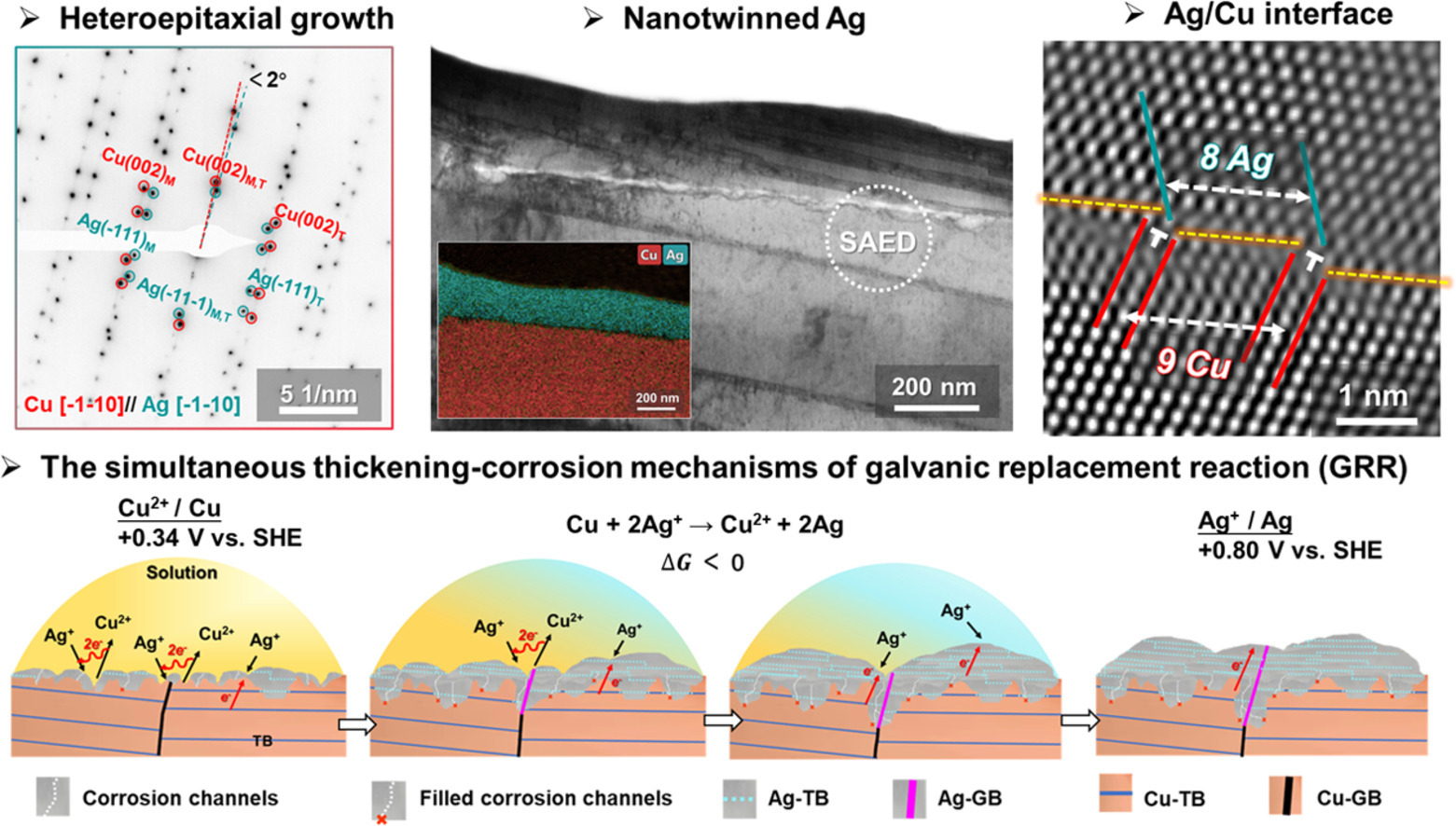 以题为“In situ epitaxial thickening of wafer-scale, highly oriented nanotwinned Ag on tailored polycrystalline Cu substrates”的相关成果论文在《Acta Materialia》上公开发表,在晶圆级衬底电铸纳米孪晶铜表面上,原位外延生长出无过渡层的具有高度(111)择优取向的纳米孪晶银膜。所获得的纳米孪晶银膜成功复制了铜衬底的晶体学信息,表现出局部单晶状和优异的热稳定性。研究成果用于芯片铜-铜直接键合封装,有望在空气环境下实现180℃低温高质量键合,而且与现有的电镀铜制程工艺具有良好的兼容性。该原创性研究以极品av 2020级博士研究生詹晓非为第一作者,朱增伟教授为通讯作者。该研究工作得到了国家自然科学基金项目(52275436)和江苏省自然科学基金项目(BK20222010)的资助。