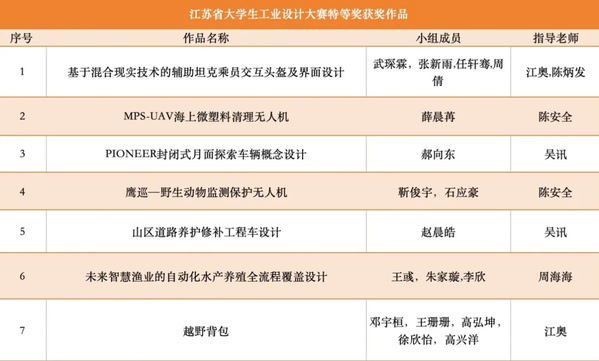 自2019年起,江苏省每年举办“江苏省大学生工业设计大赛暨全国大学生工业设计大赛江苏赛区选拔赛”,其中获得特等奖的作品将直接选送参加全国大学生工业设计大赛。本届赛事围绕智能与体验、服务与系统、文化与社会创新、时尚与生活、健康与环保共五大类别,引导全省各高校的工业设计、产品设计等相关学科专业学生进行创新设计,大赛共收到来自省内38所高校提交的参赛作品1600余件,最终评选特等奖49件、一等奖70件、二等奖80件、三等奖100件。