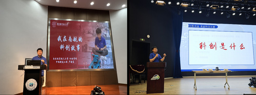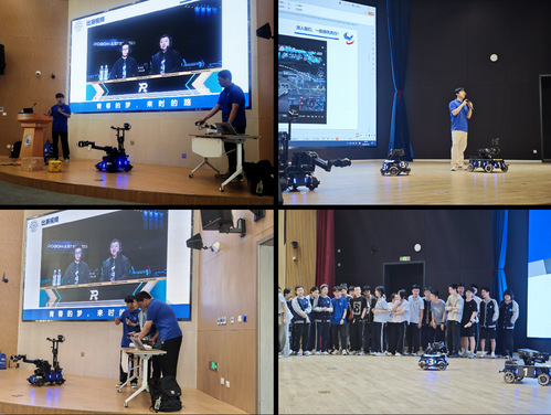 “长空御风”学生科创团队介绍了团队的发展历程与奋斗故事,讲述了团队参与科创赛事的经历与顽强拼搏的精神,并展示了团队自主设计、制造的机器人,邀请同学们上台体验机器人操作过程,引起了热烈反响。