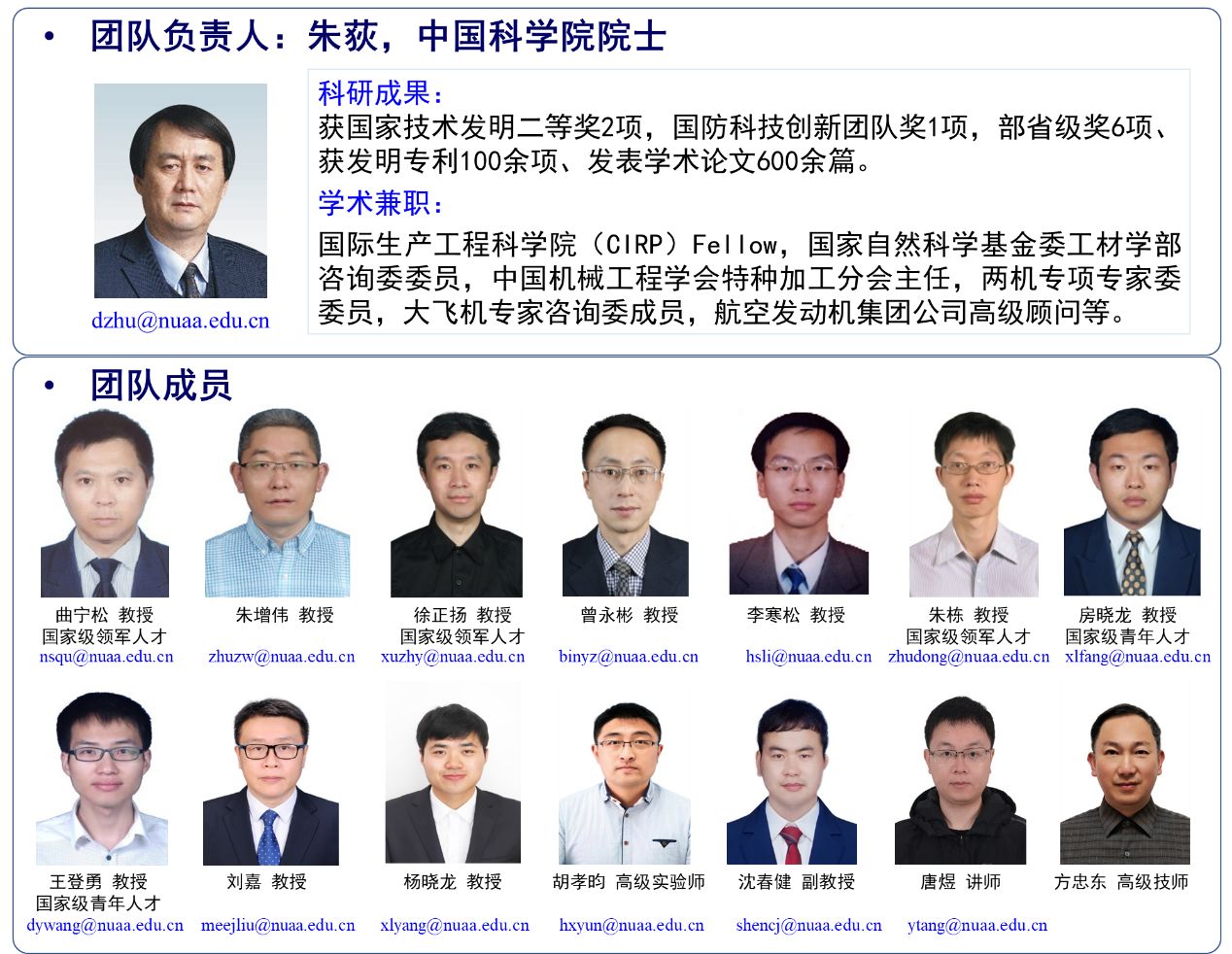 特种能场制造技术创新团队由中国科学院朱荻院士领衔,包括教授11名,拥有国家级高层次人才10人次,博士/硕士研究生150余名。团队始终面向航空航天领域重大需求,开展特种能场制造的基础理论—关键技术—机床装备—工程应用的全链条研究。近年来,团队先后牵头承担两机专项、国家重点研发计划、173计划、国防基础科研重大项目/重大工程、国家自然科学重点基金等重要科研项目十余项。