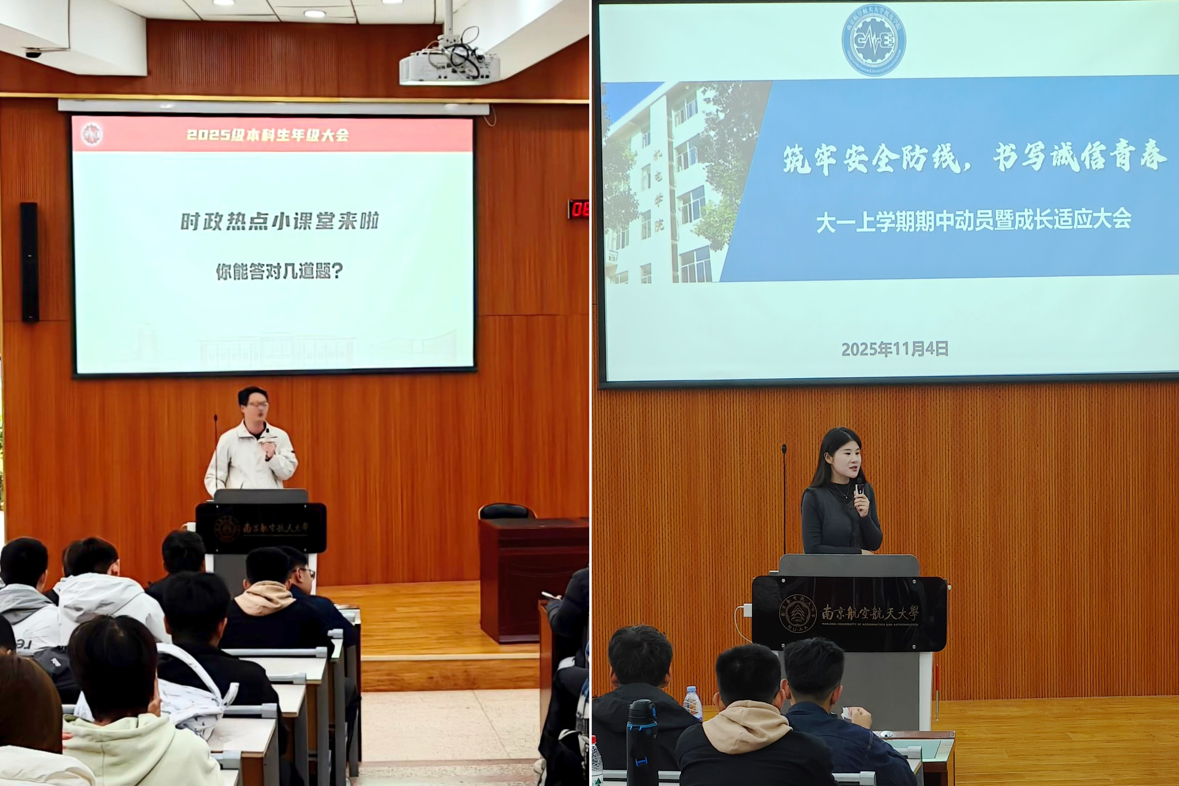 随后,辅导员苑君陶、聂敏敏依次进行分享。苑君陶在环节中创新融入“时政热点小课堂”,通过抢答互动引导学生关注国家发展与校史校情,内容涵盖二十届四中全会、神舟系列发射等,在轻松氛围中激发学生的家国情怀与责任意识。聂敏敏则围绕“诚信”与“适应”关键词展开,从学习习惯、作息管理、人际交往等方面给予具体指导。她呼吁全体新生以诚信为本,严守考试纪律,端正学习态度,实现从被动适应到主动改变的转变。